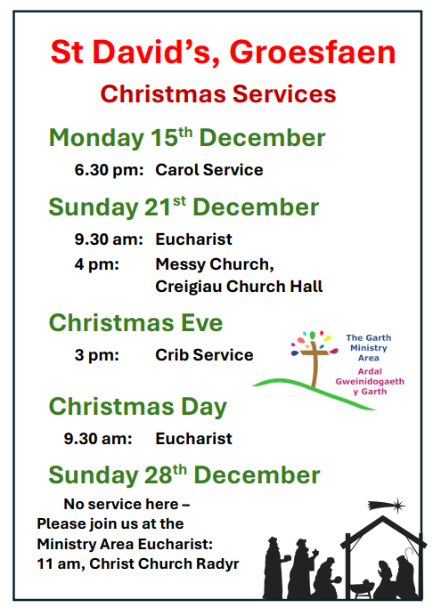 There will be a Ministry Area Eucharist to celebrate the First Sunday of Christmas at 11am on Sunday 28 December at Christ Church, Radyr. This will be the only service in the MA on this day.