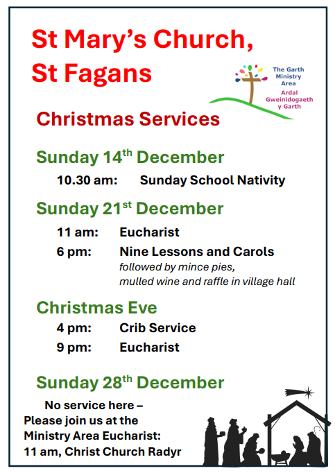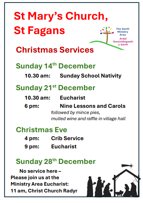 There will be a Ministry Area Eucharist to celebrate the First Sunday of Christmas at 11am on Sunday 28 December at Christ Church, Radyr. This will be the only service in the MA on this day.